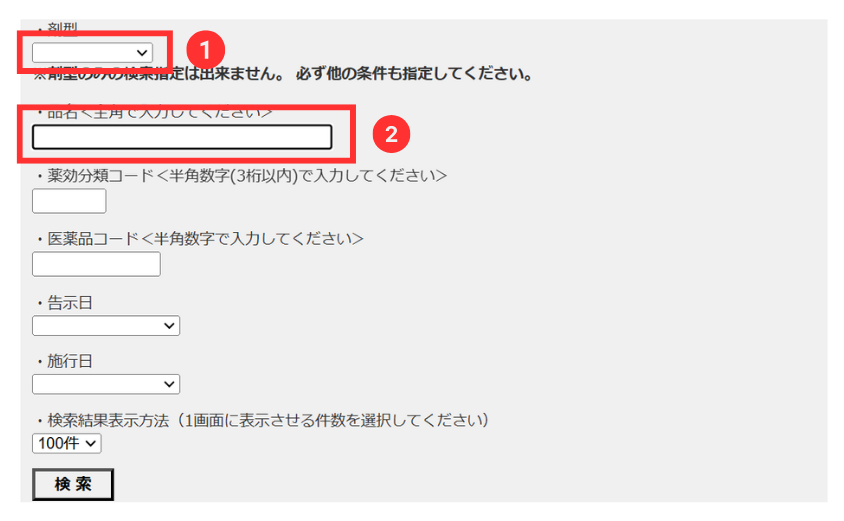 検索方法も「内服」や「外用」といった錠型を選び、あとは薬の名前を全角で入力するだけです。