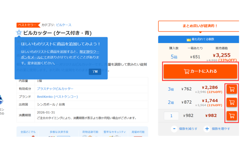- リピーター向けクーポン:2回目購入で10~15%OFF